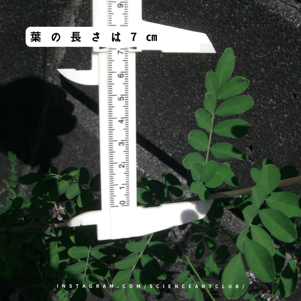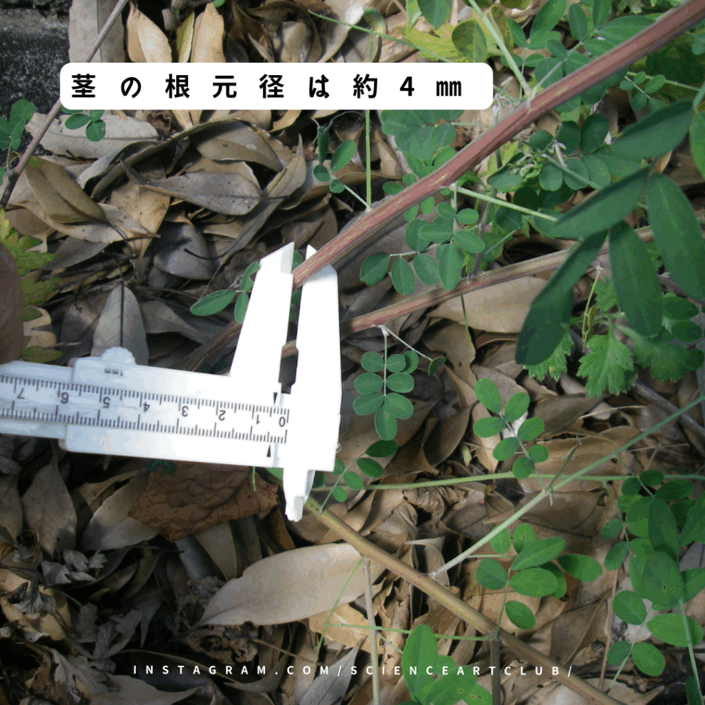 葉は4~5対の小葉を持つ奇数羽状複葉である。葉の長さは約7cm、小葉は長さ15mm、幅8mmほどの楕円形である。葉は多くなく、茎が目立つ。茎は淡赤紫色で、茎の根元の太さは4~6㎜で堅い。