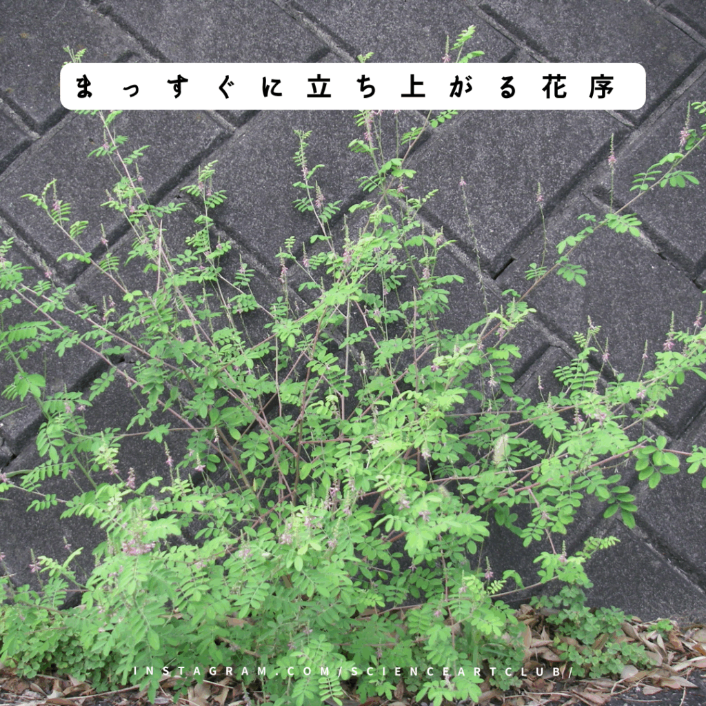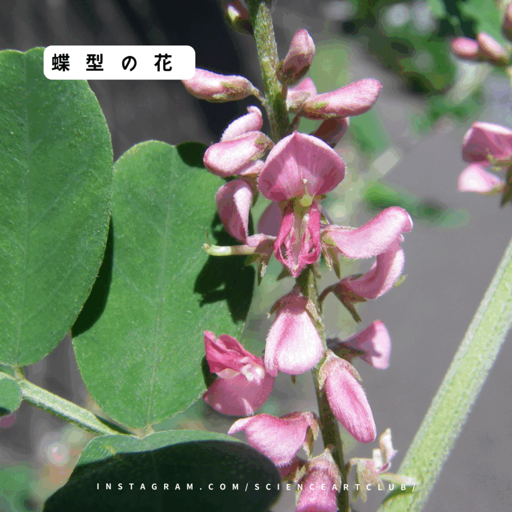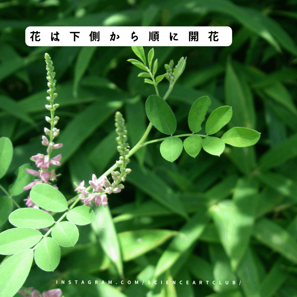 花は茎の葉の付け根から短い花柄を伸ばして先端部に総状花序をだし、下側から順に小さな花を開いている。一つの花は蝶形で長さが5mmほどである。総状花序の長さは最初には短いが、開花するにしたがって茎が伸びていく。長いものは20㎝ほどになっている。