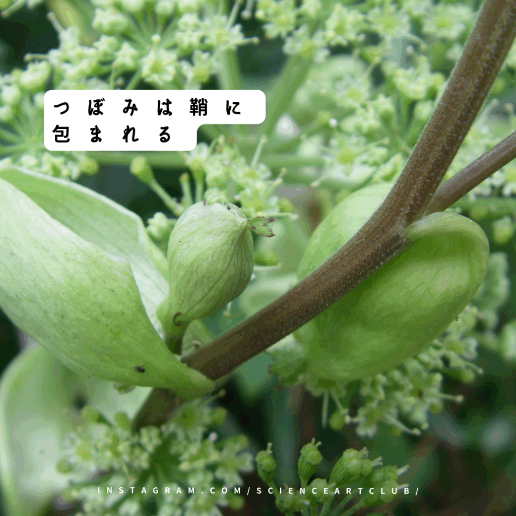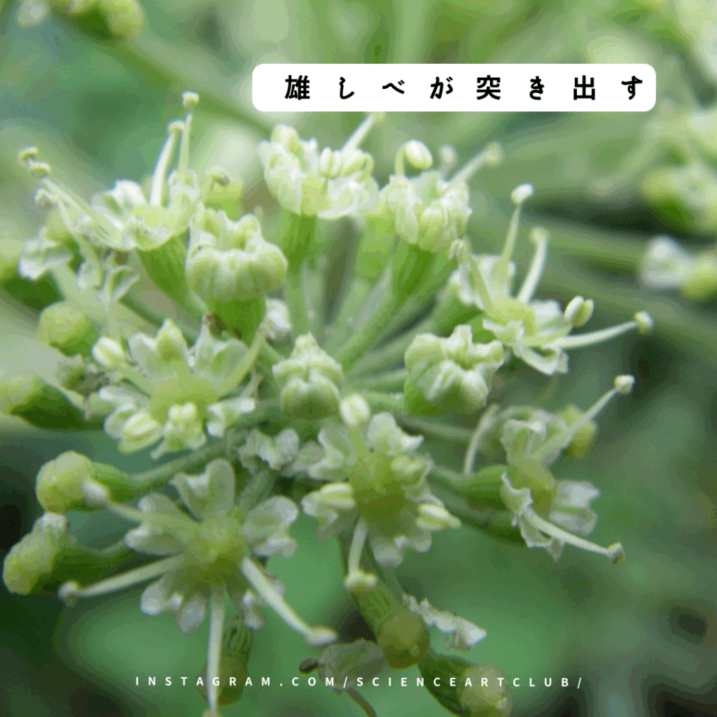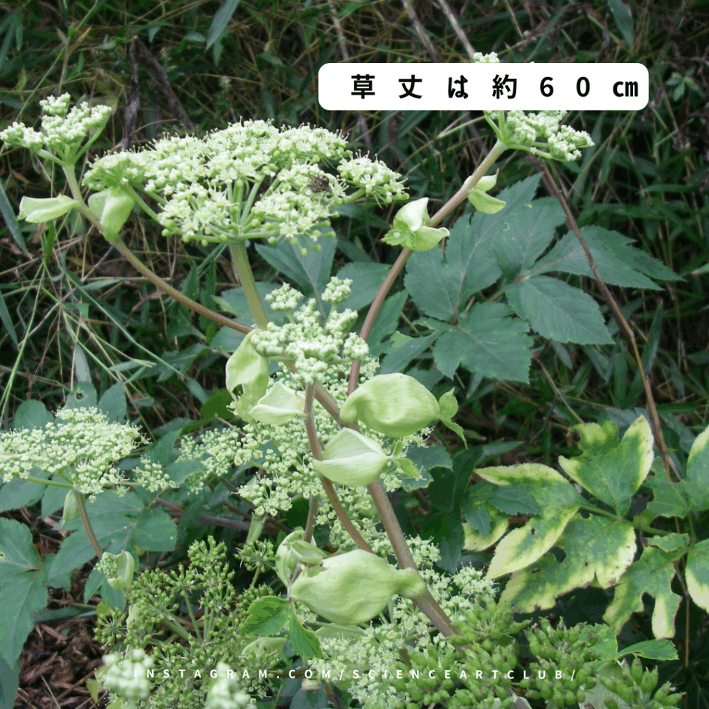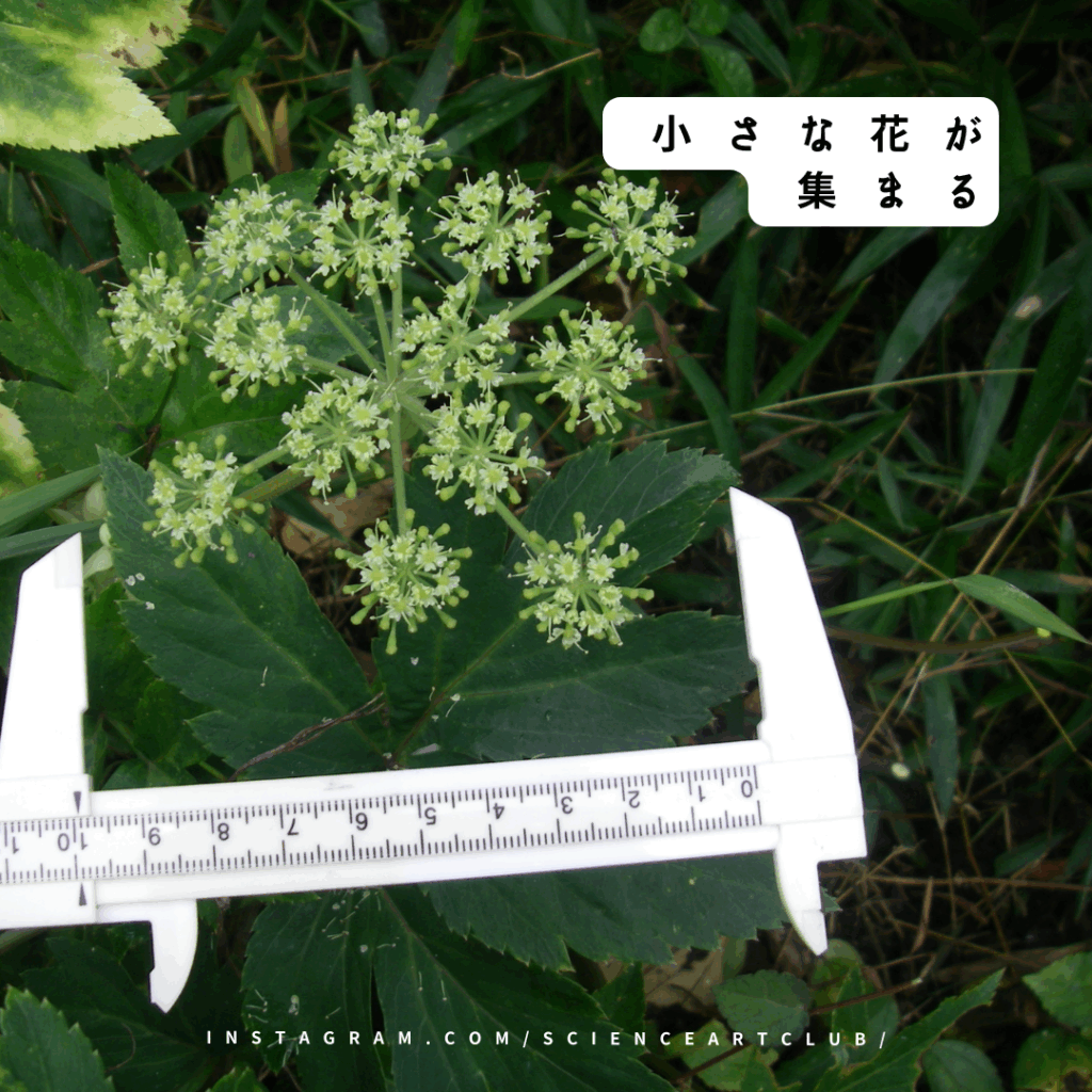 花は白っぽく見えるが、近くで見ると、淡い黄緑色である。一つの花は直径5㎜ほどの小さな5弁の花で、雄しべが飛び出している。花が多数集まり、その花の集まりが15個ほど集まって直径10cmほどの円形皿状の形(複散形花序)を形成している。花の付け根には葉柄が膨らんだ袋状の鞘があり、その中から花序が伸びている。