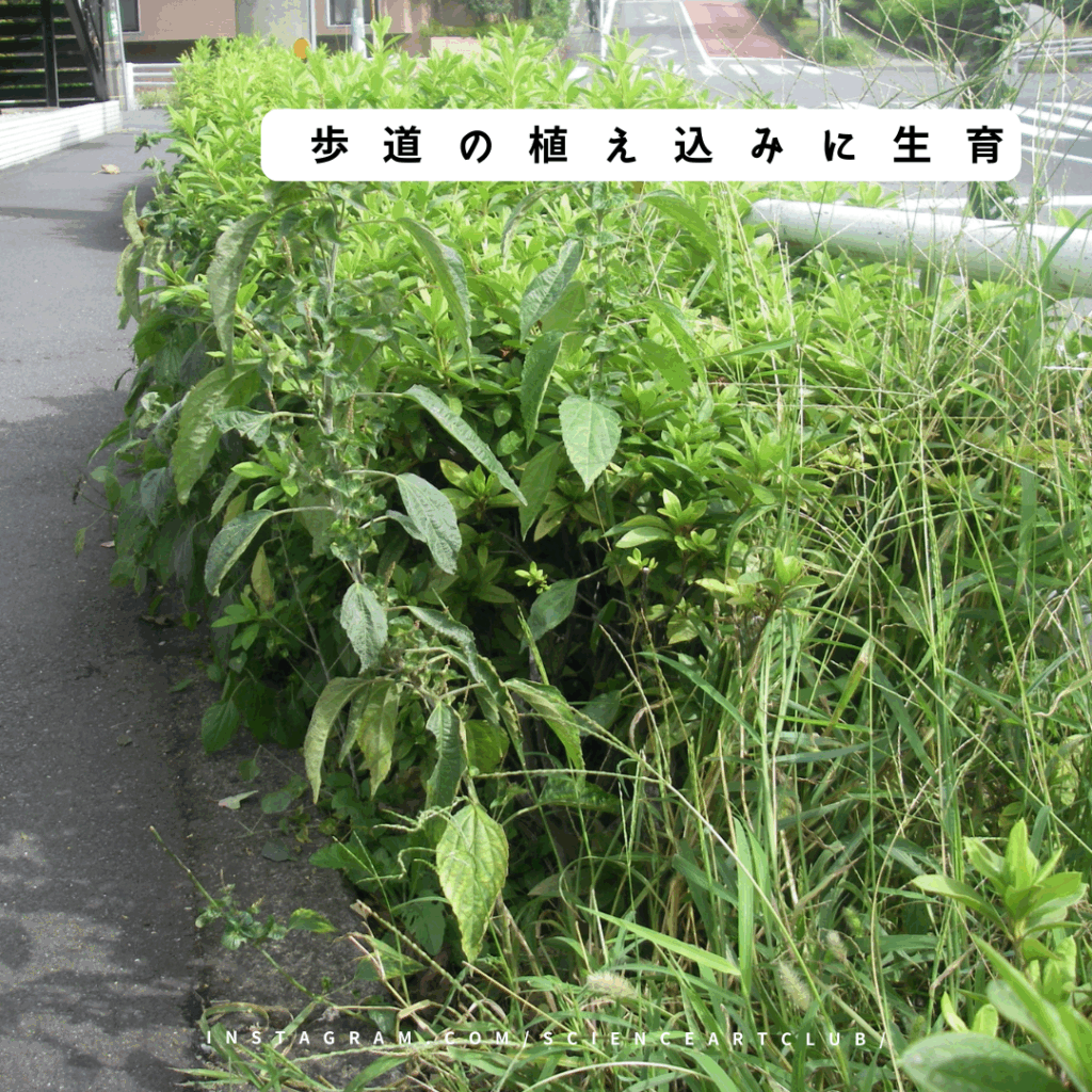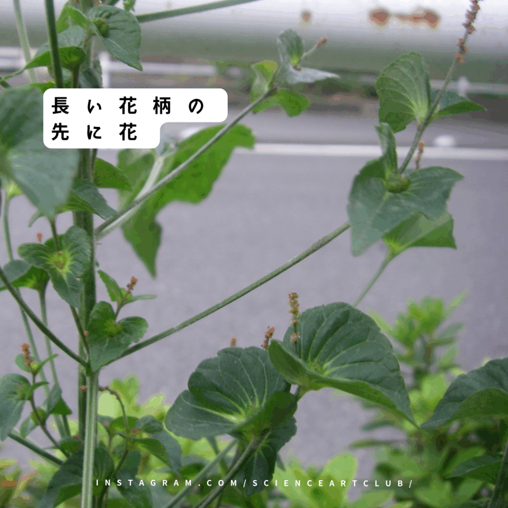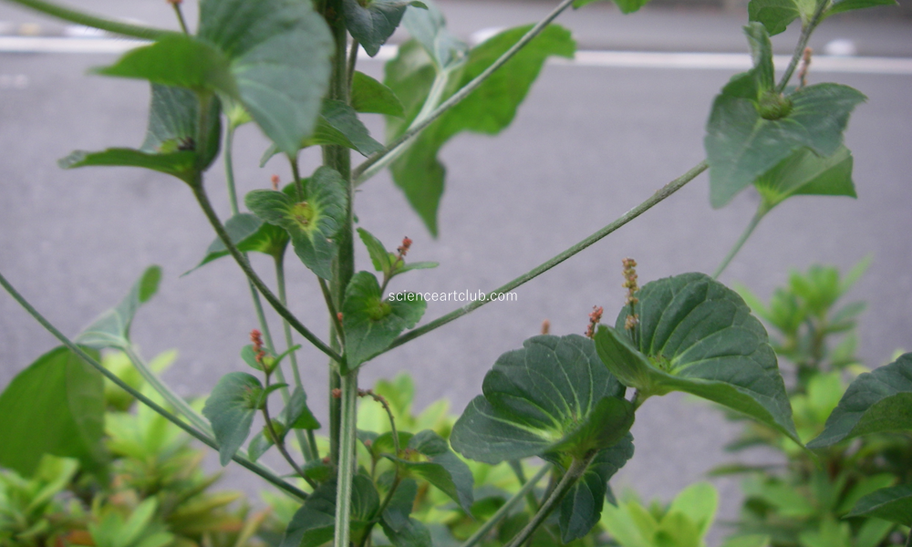 多摩丘陵の谷部にある歩道の植え込みの中でエノキグサを見つけた。低木の植え込みからまっすぐに立ち上がっている。草丈は約80㎝である。よく見ると長楕円形で先がとがった大きな葉とハート形の葉(総苞)がついている。