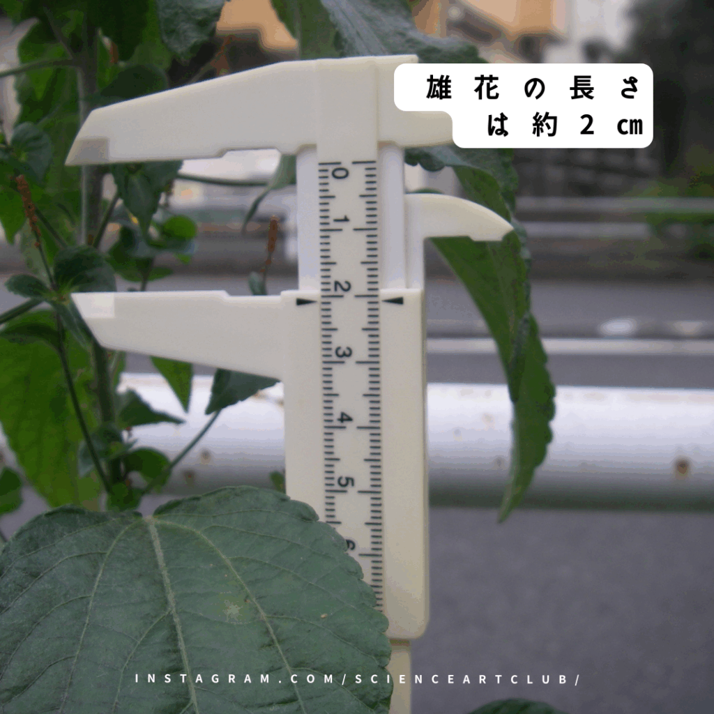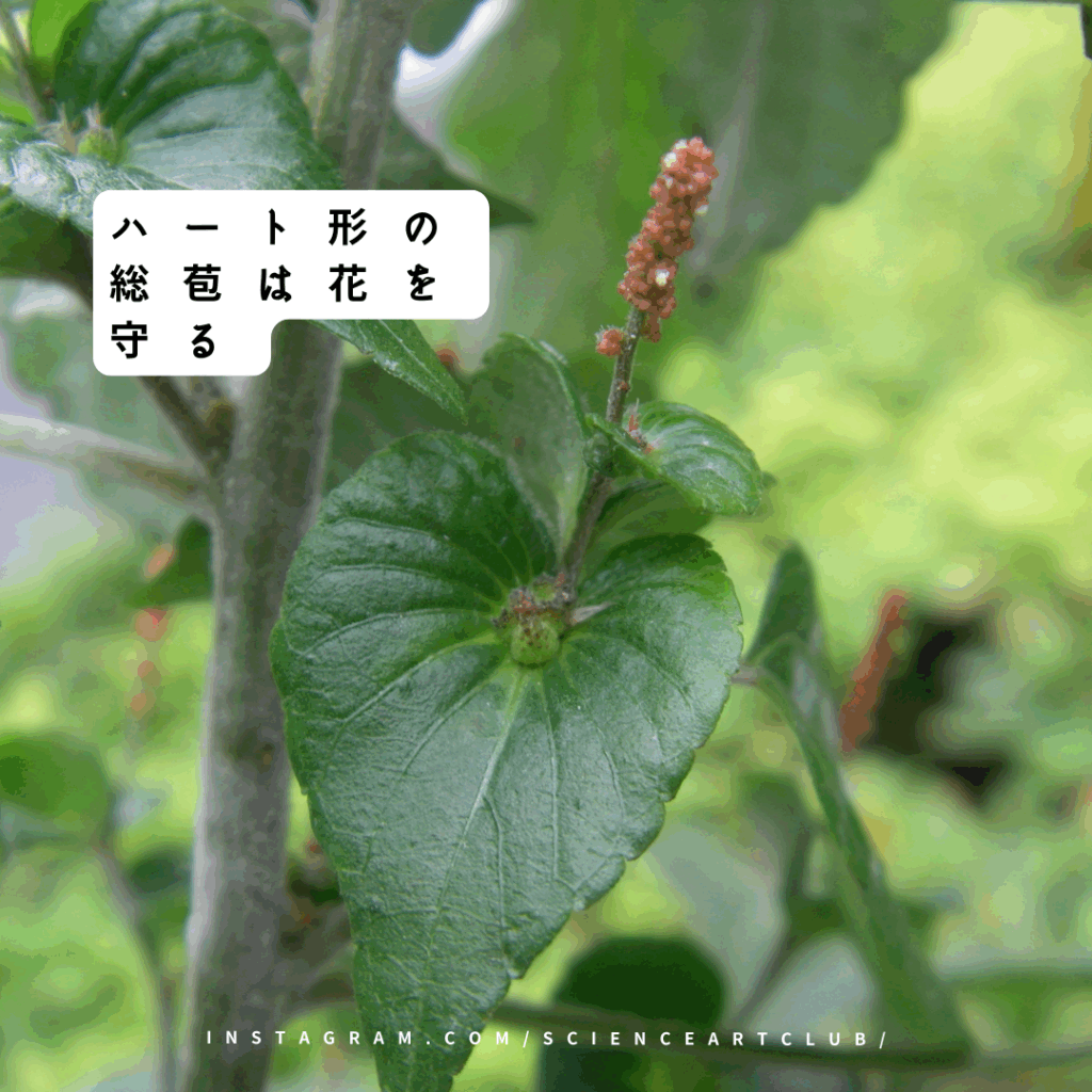花は葉の付け根から斜上して伸びた二つ折りのハート型を広げたような総苞の中にある。総苞の底に雌花、真ん中から細くき出して棒状のものが雄花穂である。雄花の部分は淡赤紫色である。ここに粒状の雄花が咲くそうだが小さくてよく見えない。雄花穂の長さは2~3㎝である。雄花穂は成長して長くなる。