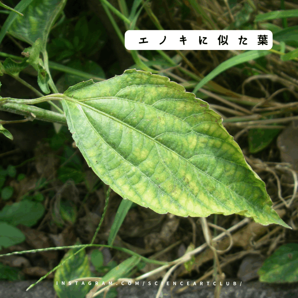 葉は互生し、長楕円形で先端はとがり、縁の半ばから先に鋸歯がある。下部の方の葉が大きくなる傾向がみられ、大きな葉は葉柄が約5cm、葉身の長さ約10㎝、幅約5㎝である。葉身の中央の葉脈(主脈)はまっすぐであり、葉の縁と中央の間の葉脈(側脈)が弧を描いており、エノキの葉と似ていることからエノキグサと呼ばれる。エノキの葉より先端が細長い。