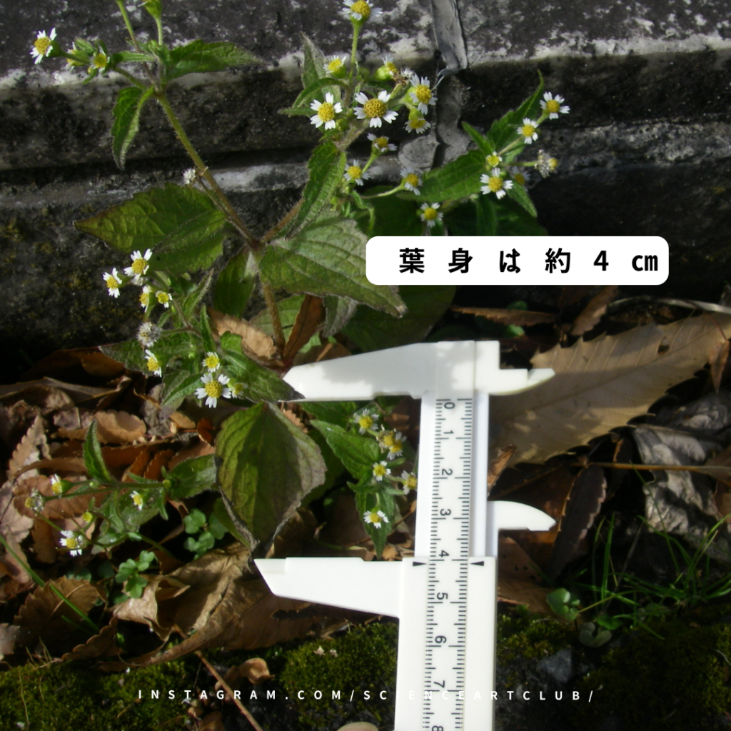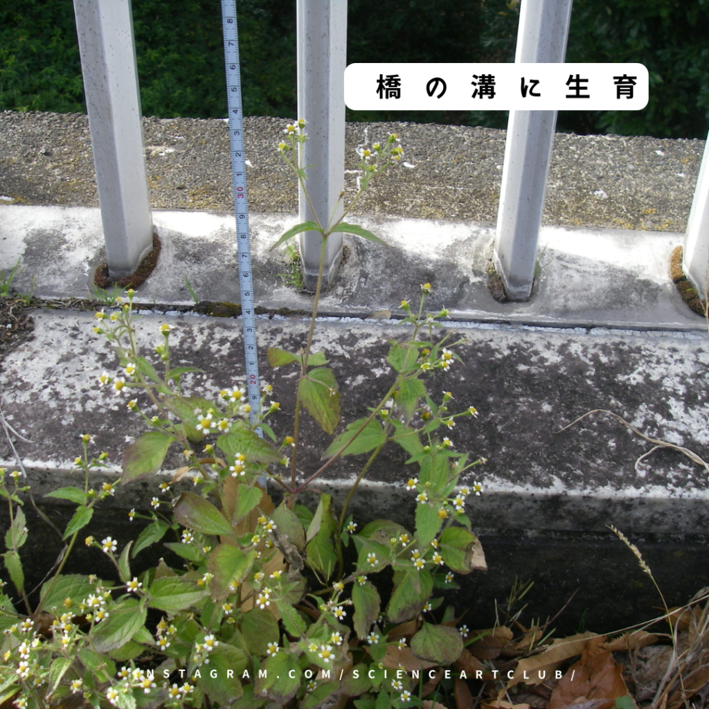 図鑑に記載してある花期は6~11月である。ハキダメギクは夏の頃から、道端などで群生しているのを見かける。橋の上の環境は厳しく、夏の暑さと少雨で枯れてしまい、夏過ぎに芽を出したものが生育して、ようやく花が咲いたのだろうか。
